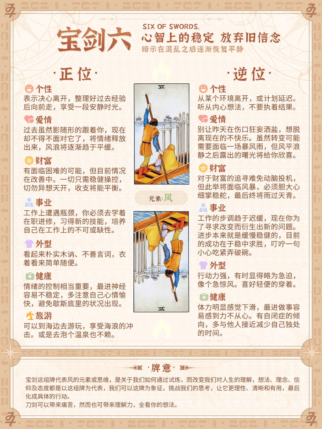 象征伤害的的六把宝剑不能拔起,否则船会沉没。他们只能带着危险前行,与伤害结为旅伴。事情不很糟,但也不会很好。船夫手中的黑色竹篙,黑色象征潜力,已为将来会发生什么事情,不要将自己困死了,驶过汹涌,就是水域的无边平静。
