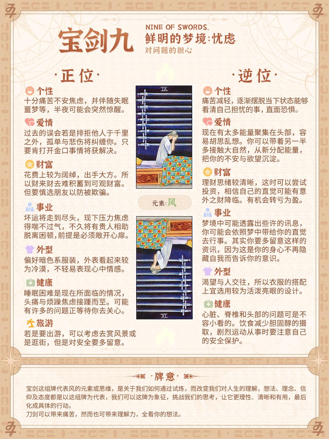 人们在晚上的时候,悲伤和悔很总是来得特别强烈,当白天让人分心的一些琐粹杂物结束后,人们总是沉静在自己的想法中,被折磨得彻夜难眠。宝剑九代表的就是这种随时像我们袭来的不快。不同于宝剑三所代表的痛楚,在那里是指来自外界的烦恼,而这里代表的是来自内心的煎熬。