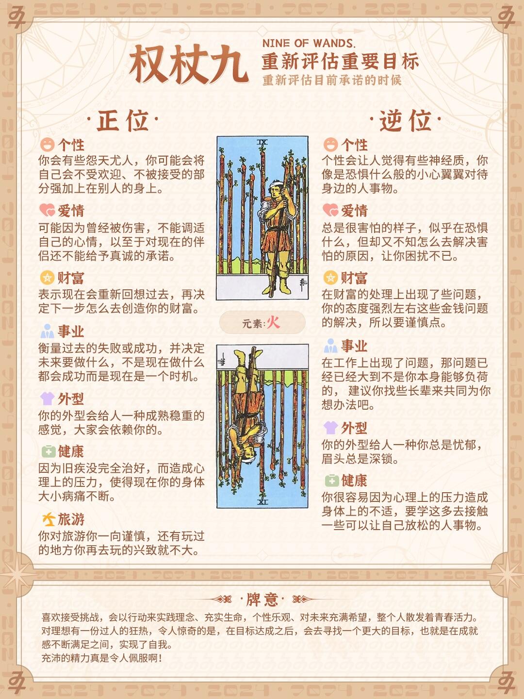 这个战士已经受了不少战争的洗礼。图案在告诉我们当我们经过一段艰难旅程的时候,我们疲惫,受伤害,或者即使我们没有身体上的伤痕,可是我们的灵魂已经受尽折磨,我们原有的童真,心胸的宽广坦荡,对人的信任都一去不返了,取而代之的只是一种自我防御。它提醒着我们,要更加细心的处理事务,保持警醒,因为随时都有可能出现伤害。图中那位士兵虽然已经伤痕累累,但是依然没有倒下,他顽强的站着,永不放弃。这就是权杖九的内涵所在。这张牌告诉我们,不管面对的是什么,永不放弃!即使所有人,一切事物看起来都像要反对我们的样子,也不要屈服,要坚信在我们体内,有一种能量足以让我门赢得胜利。