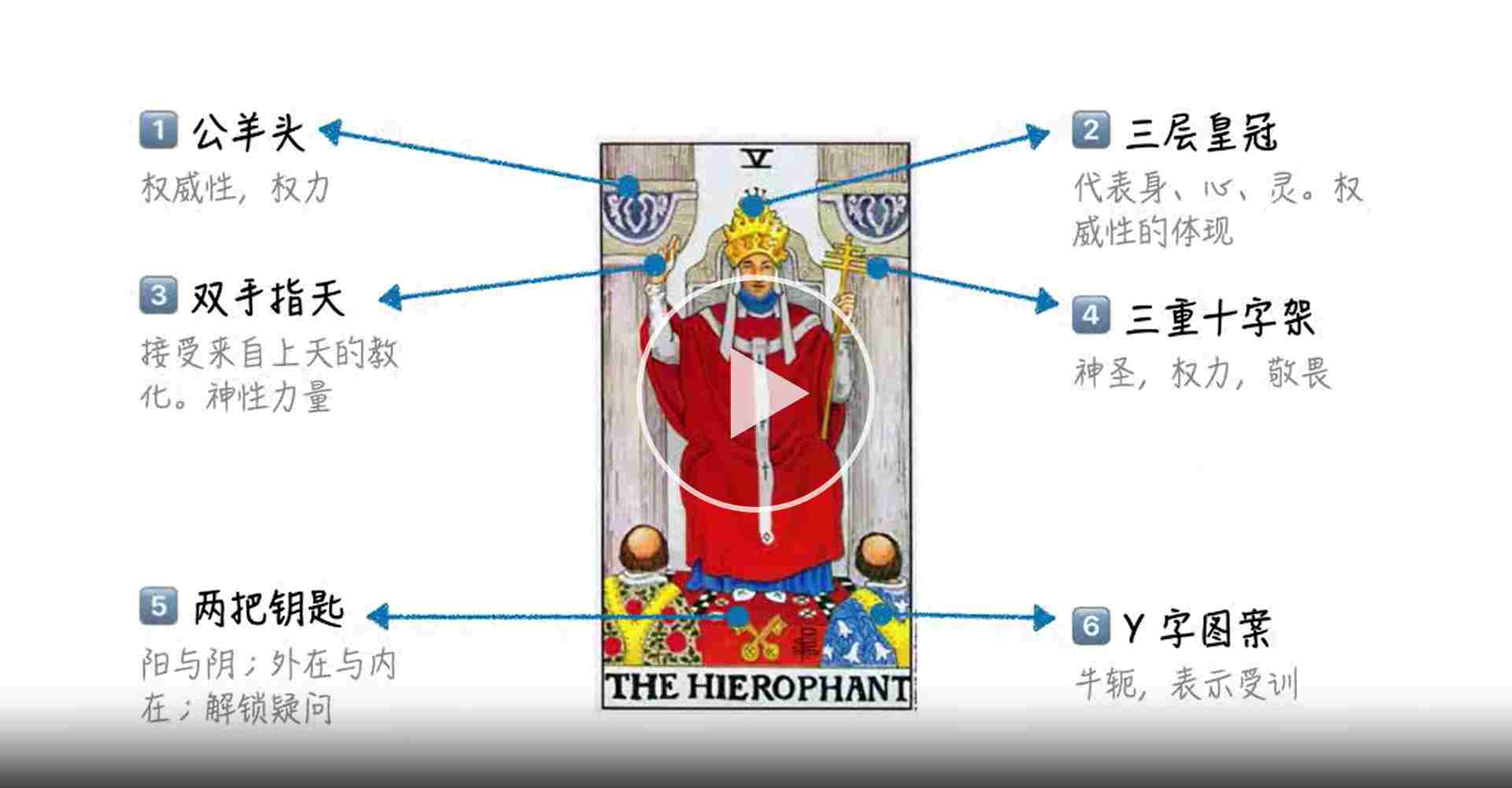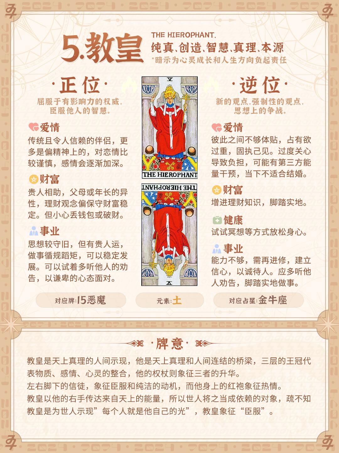 这是一张代表唤醒良心与善良觉醒的牌,同时也是张关于宗教信仰与传统的牌。同皇帝所代表的物质主宰相比,他更趋向于精神层面,他是精神方面的权威,是未知世界的解释者。因为教皇能够直接与上帝联系,他用慈悲与洞察力试图拯救世人的灵魂,并用自己的言论引导人们走向正途。