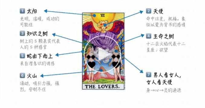 恋人牌以伊甸园为背景,依亚当夏娃的爱情故事为背景,阐述了爱的真谛。牌图中亚当夏娃分列两边,在天使的祝福声中感受着爱的浪漫与温馨。天使身着紫袍,据说代表爱的忠贞,而为张的双臂则预示了沟通在恋爱中的重要地位。右侧的亚当目不转睛的注视着夏娃,而夏娃却仰望天使,再加上天使俯视亚当与夏娃,这种视觉上的循环,象征了潜意识、意识、超意识与物质、精神、道德之间的层次变化,也暗示了理性与感性之间的传导。