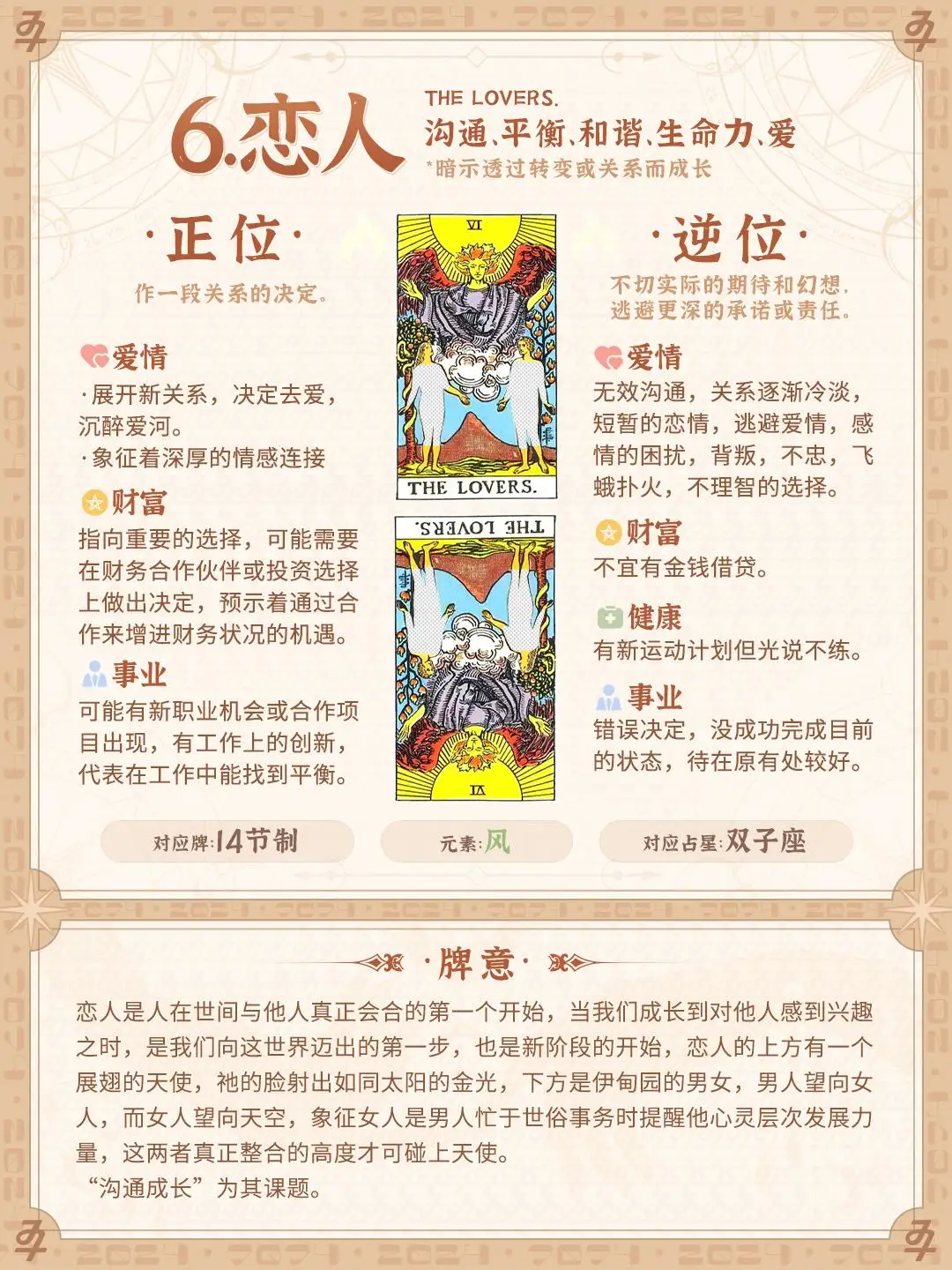 这是塔罗牌中解释爱情最好的一张牌,他代表这人生的青春期。牌面中一对男女在天使的召唤下走到一起,成为恋人。尽管阳光普照,充满了幸福的感受,但恋人的后面却有着很多考验在等着他们一一希望之树和毒蛇盘踞的禁果之树。