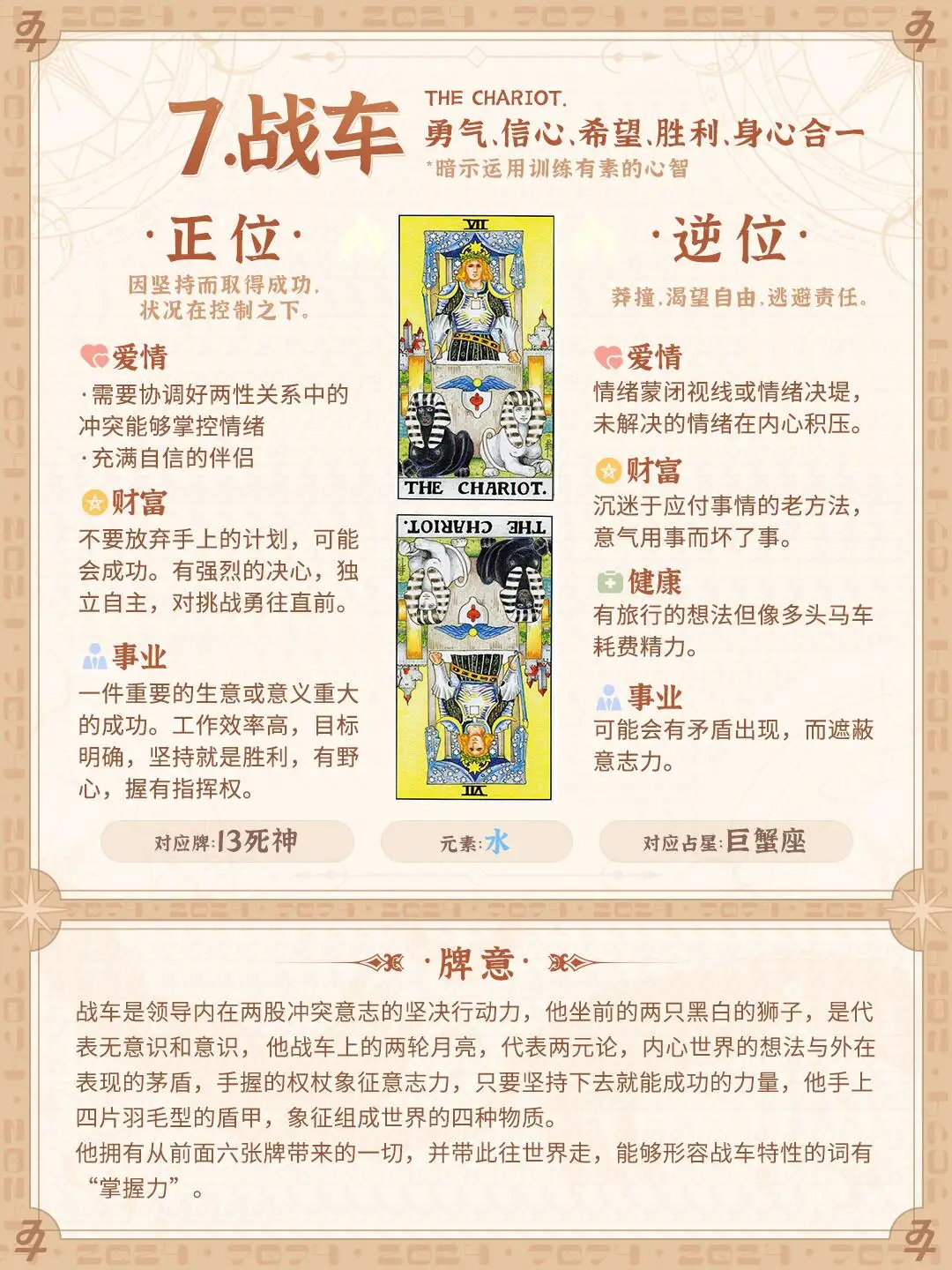 一位头戴八芒星战盔、身着盔甲的勇士驾着一辆由两只狮身人面兽拉着的战车,向着胜利勇往直前,气势无人可挡。车前左侧的黑色狮身人面兽代表严厉,而右侧的白色狮身人面兽则代表慈悲,双手并行,恰恰预示了阴阳调和,即追求胜利的前提一一平衡。蓝色的车篷和上面的六芒星图案,象征了天体对战士成功的影响,也预言了希望对于获得胜利的重要性。勇士右手紧握长矛,表明了他内心对胜利的渴求,胸前的正方形则代表土元素,象征意志的力量。战车前方的一对翅膀相传是古埃及图腾,代表灵感,而翅膀下面的小盾牌中则相传为古印度预示阴阳结合的图腾。作为塔罗牌中的第7号牌,站车似乎预示了走过了三分之一旅程的愚人已经变成了一名成熟、勇敢的战士,在追求胜利中披荆斩棘、奋勇向前。