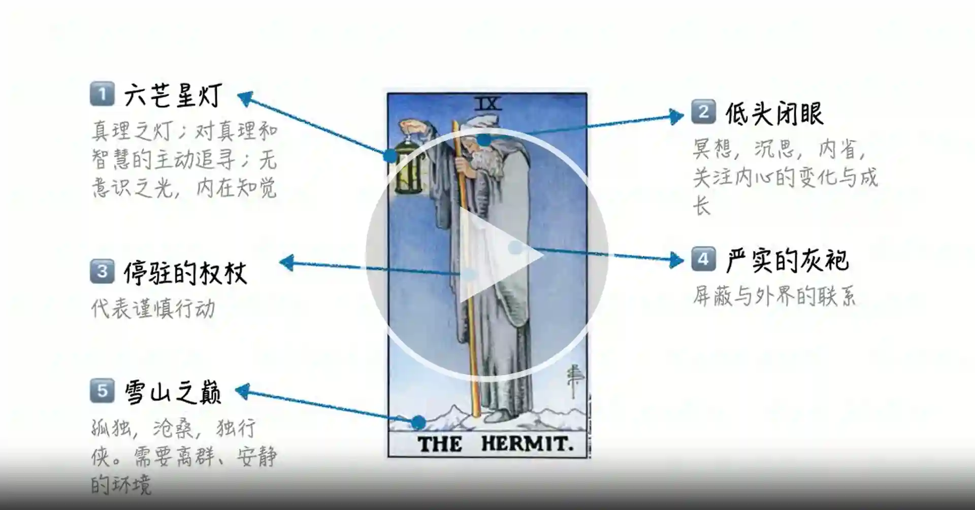 隐士身着长袍,提着一盏灯、拄着拐杖,在黑暗中孤独地摸索前进。这张牌代表独处,隐士试图放弃外在的诱惑,而达到内心的平静,进而在寂静的环境里通过冥想得到真理。寂静中只能听到自己内心发出的声音,所以才能够更好地理解自己的想法,寻找到一个真正属于自我的最终目标。