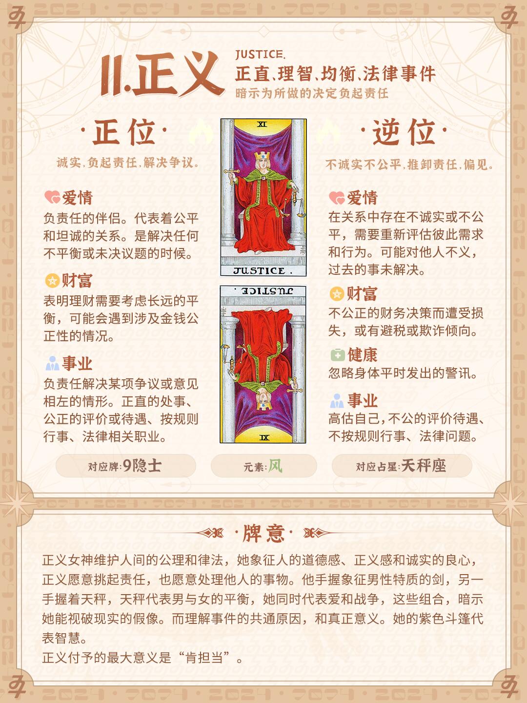 牌面描绘着冷酷的正义女神端坐在石椅上,右手拿着一柄正义之剑,左手拿着一架辨识善恶天平。