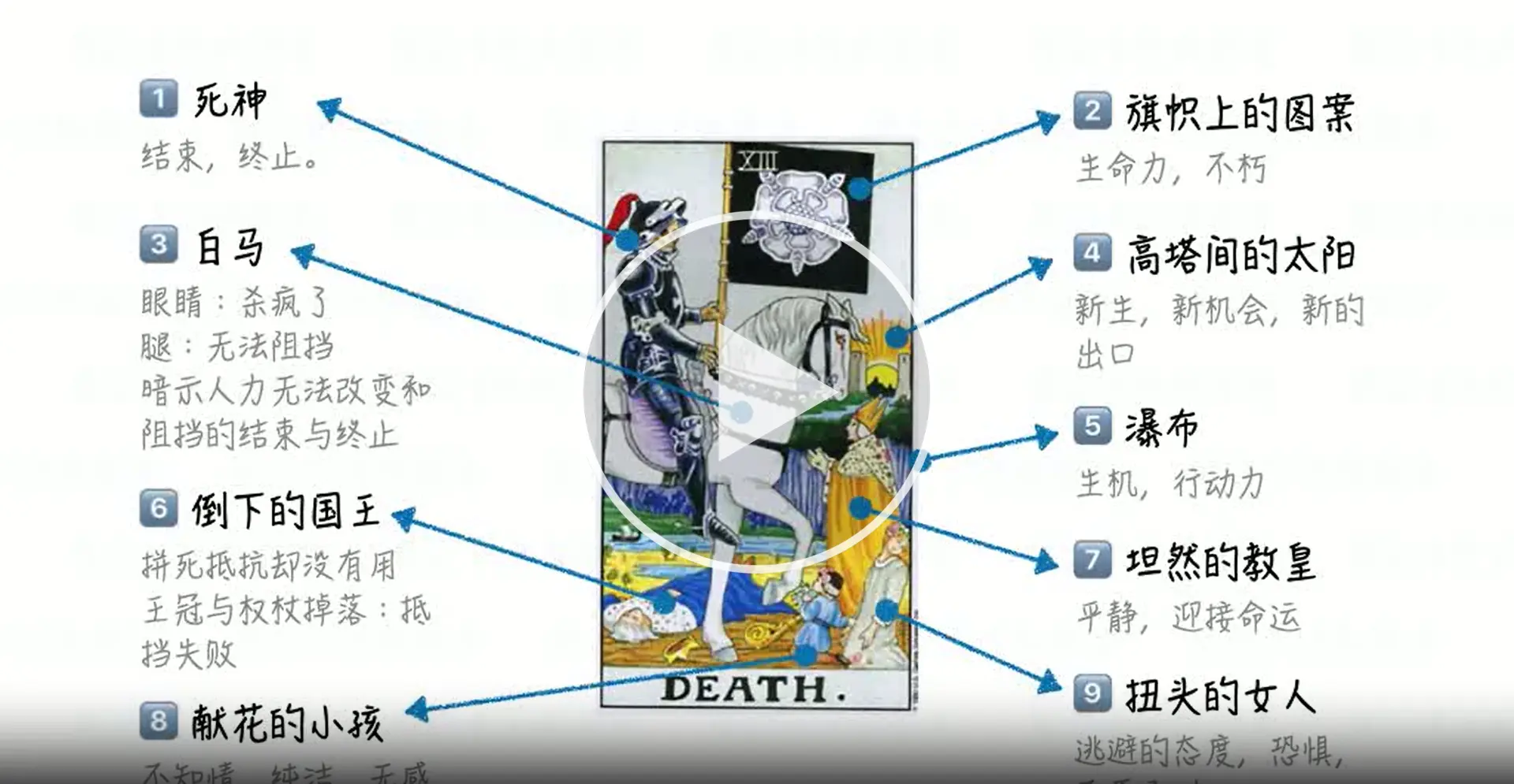 死神坐骑白马,高高在上,俯视地上的生灵,在他的手中高举一面绘有蔷薇十字会图腾的黑色旗帜。有人说这个图腾代表死后获得新生的过程,也有人说这个图腾与火星相应代表不朽生命力。在死神的马下,分别是国王、圣职者、妇女和儿童,代表终生对死亡的四种看法。国王抗拒死亡,最终被践踏于死神的马蹄之下;圣职者将令牌置于地上,崇敬死亡,并上手合十祈祷主的引领以求步入天堂;妇女跪在地上,因对死亡的恐惧而昏厥过去;只有那个天真可爱的孩子因为无知而满脸稚气好奇地看着死神。四个人,四种心态,无论是抗拒、崇敬、恐慌还是无知,都在阐述这相同的道理一一无论是富贵还是贫穷、无论是男女老少,死亡都是一种不可抗拒的自然现象,无法逃避,也无需逃避。