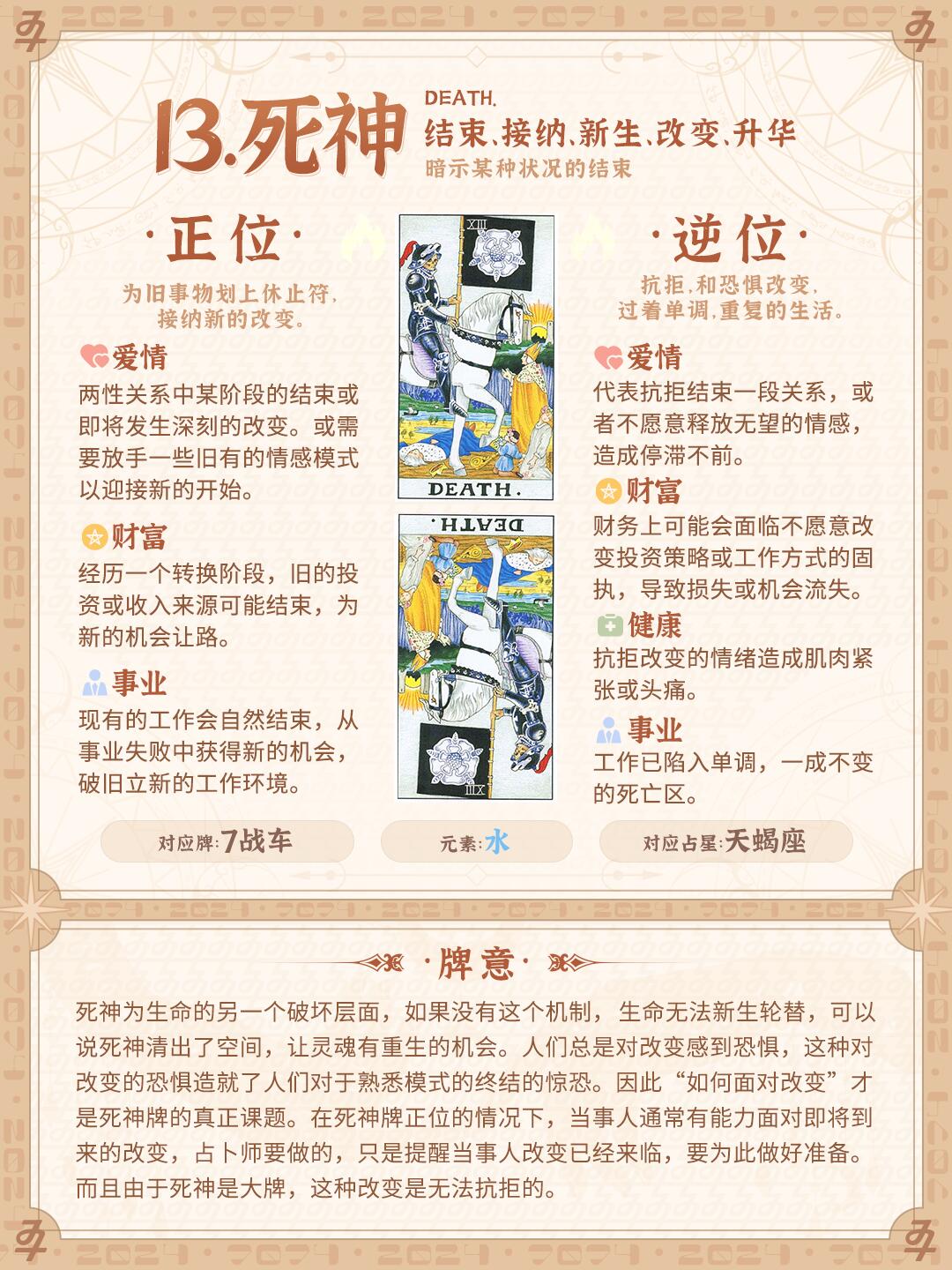 有人已经倒下了,有人接受这残酷的现实,有人试图回避,也有人在做着无谓的反抗。根据古历法第十三个月份是死亡及重生的月份,所以你不必去从牌面理解,而是要从积极的意味上去解释。接受眼前的事实,放弃一些到手的利益,你还可以得到更优厚的回报,正所谓“置之死地而后生”,经过磨难成功将更伟大。