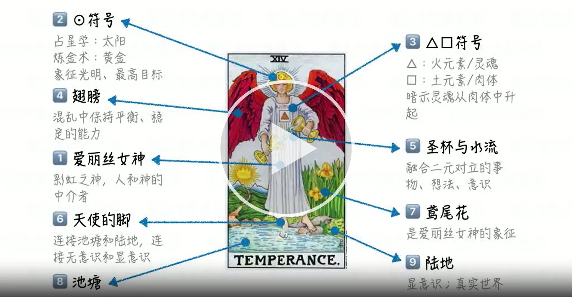 一名天使正在将代表灵魂与生命的水从一个圣杯倒向另一个圣杯。有人说,右手圣杯中的水代表意识,而左手中的代表无意识,也有人说它们分别代表物质与精神。但是无论如何,至少我们在牌图中看到了一种交互,无论水从哪里来,到哪里去,水都在流,而流动不正是一种调和与净化吗?天使一只脚站在水中,一只脚站在岸上。按照西方文化水代表内心的精神世界,土地则代表着外界的物质世界,那么天使如此站立恰恰预示了我们在物质与精神两个世界徘徊的人生,而以水中之足为实,岸地为虚,则恰扣主题,暗示人们节制欲望、净化心灵。
