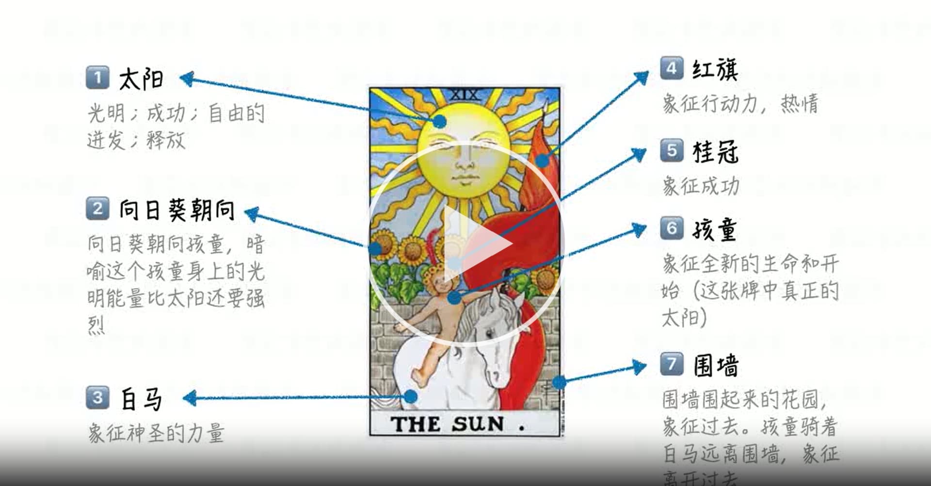 牌面中一个小孩骑着一匹马在歌颂着太阳带来的生命力,接受着太阳赋予他的能量。太阳的力量如此强大,它给世间万物以生命,它的光芒如此温暖,所有的生命都为之感动。