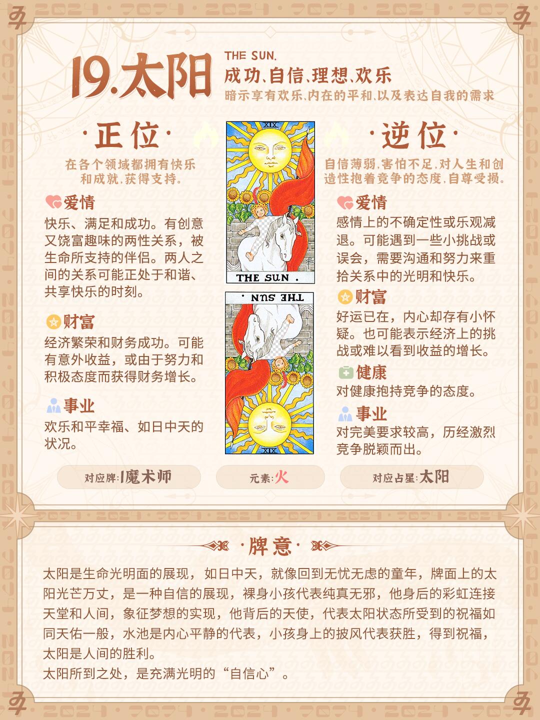 它的力量完全是正面的,充满希望和理根,任何黑暗都抵挡不住它的光芒。解牌的关键在于“生命力”,它是希望和理想的力量,不受任何外在的干扰与内在的对抗,即便有内心的黑暗面想要出来干扰你,但在太阳的光芒下,它们立刻就会消失,所以不必为一些烦恼所困扰。