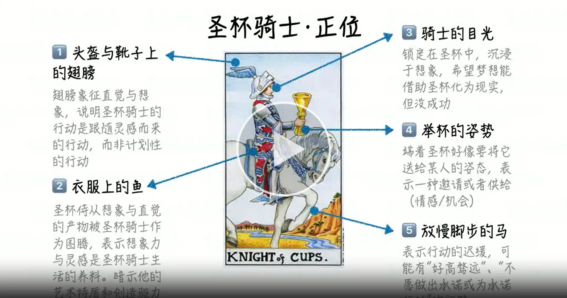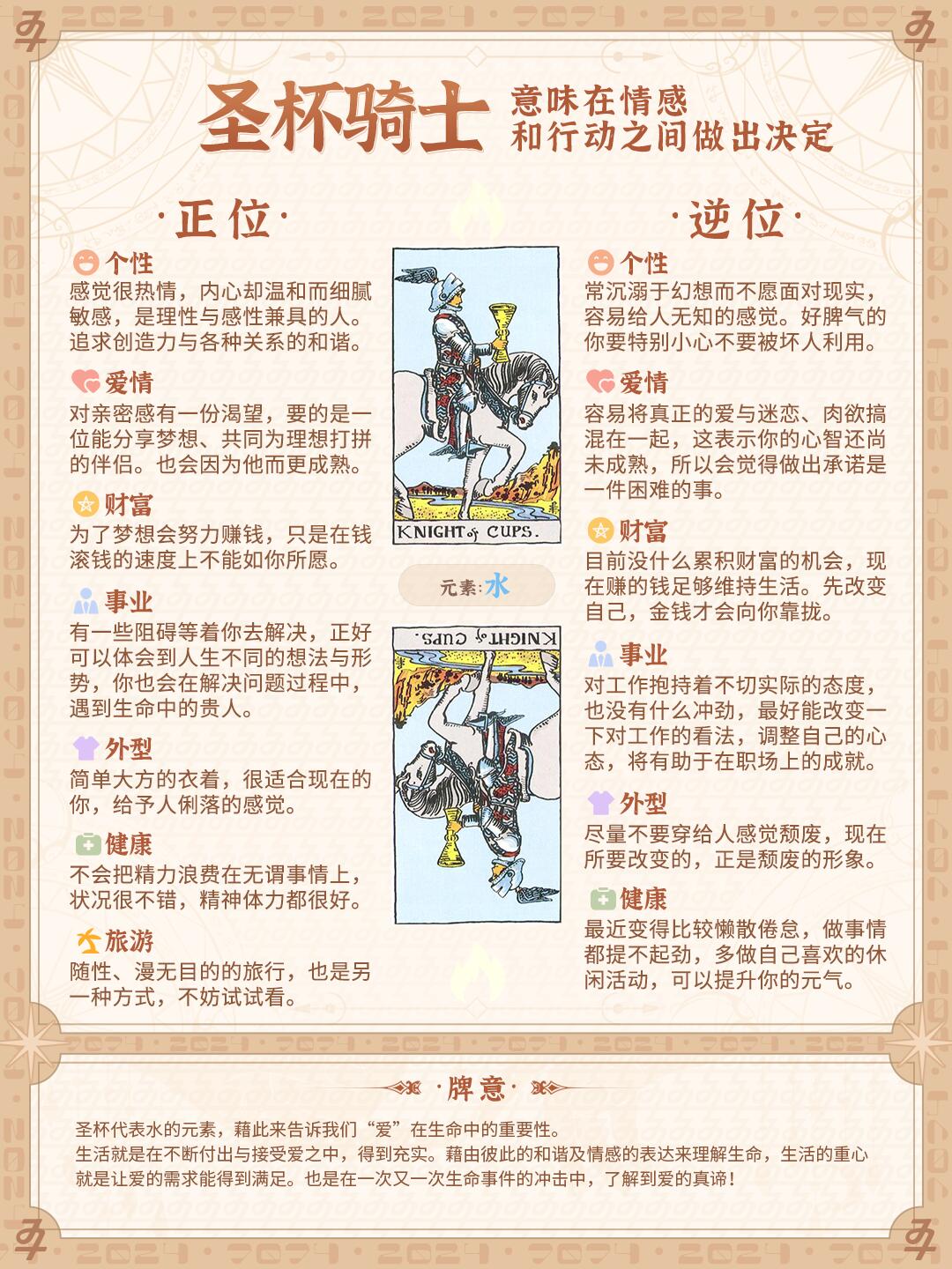 整个画面充盈着执著和浪漫的气氛。在这儿,骑士代表着感情丰富,重直觉且有创意的一类人。