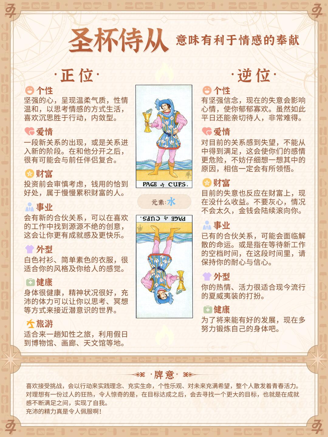 一个年轻男子,叉腰站在蔚蓝色大海前,高兴着看着圣杯中喂养的鱼。他的天真让人想起一个善良无邪的孩子。他感情丰富,富有爱心,他是爱和温暖,亲密的象征。