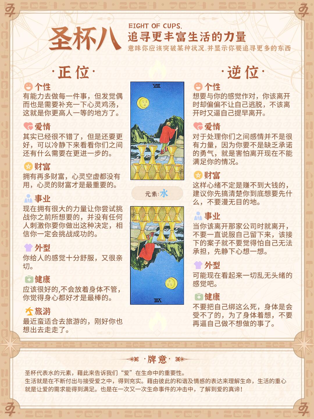 八个杯子中缺少一个,象征着万事万物总有美中不足。不满足于此的人,就继续追求。由此可看出,圣杯八也代表着一定的牺牲精神。