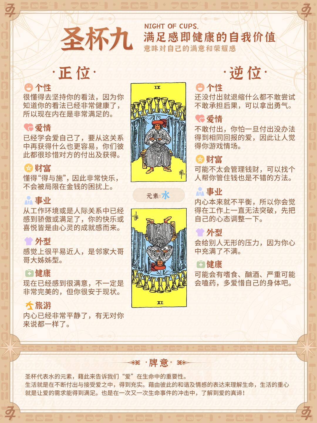 不难看出,圣杯九代表的是一切感官的愉悦,包括视觉,味觉,触觉上的享受。从个人角度看,圣杯九暗示当前的一种生活状态。