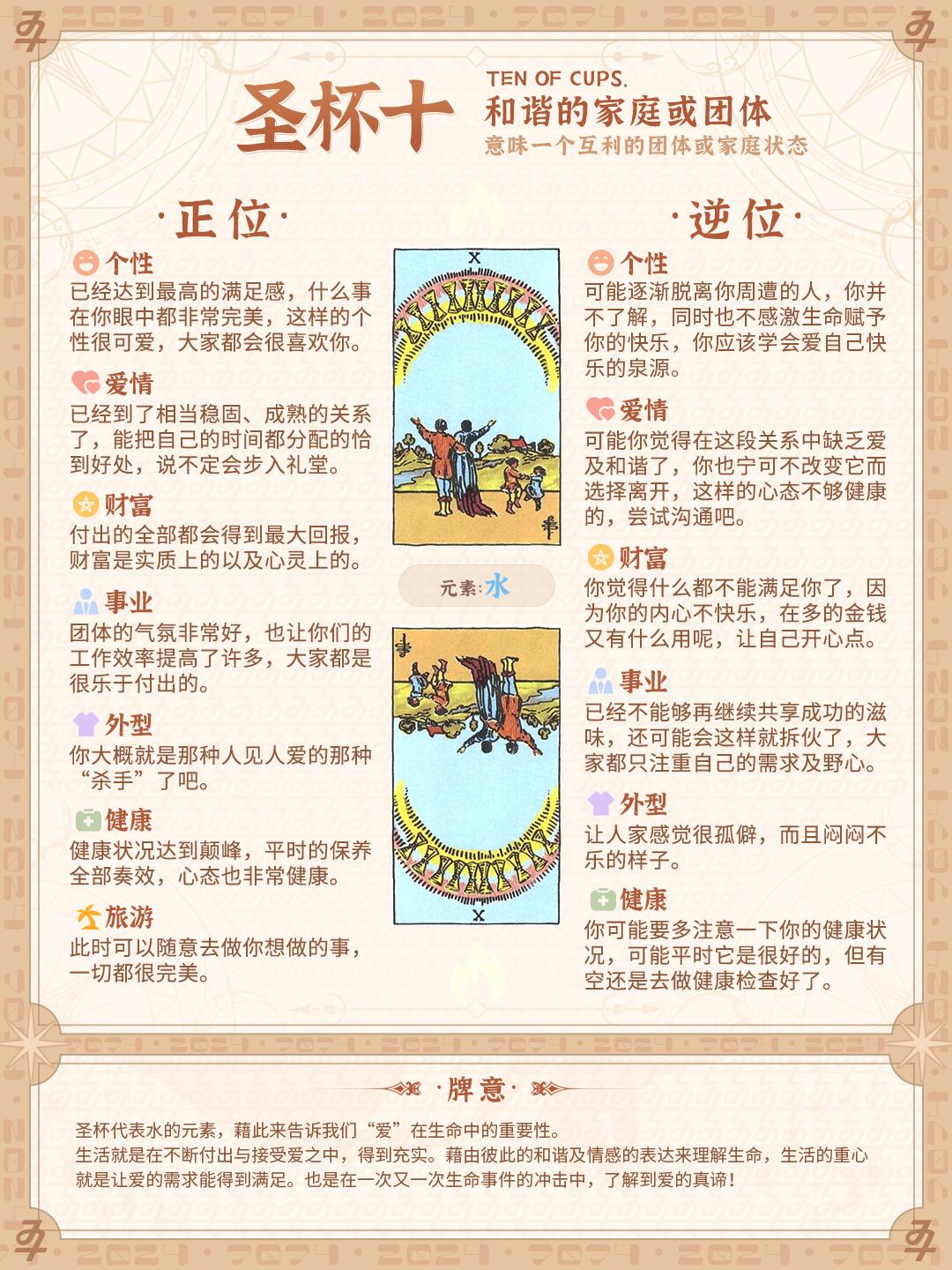 两个孩子在一旁快乐的嬉戏。远处是他们的家。这是一副温馨感人的画面。这张牌主要代表以感情相关联的团体,如家庭,社团,公司,几个知交好友等。圣杯十指的是个人的成熟与满足,此牌白表现的是人际关系中的快乐和满足。
