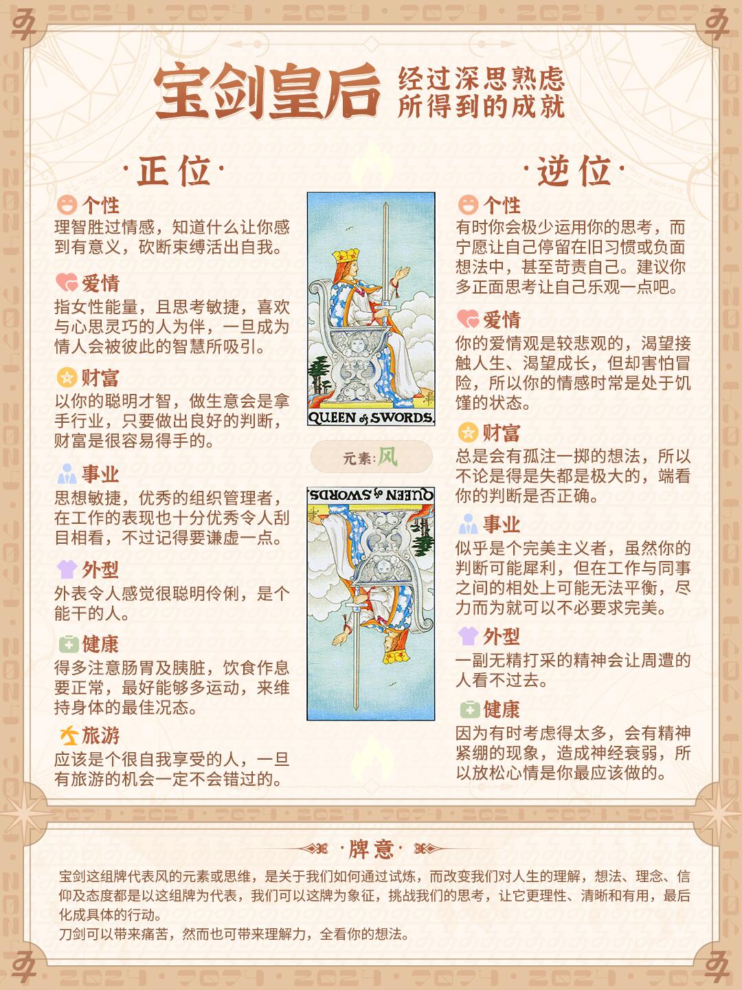 她通常单身(一般被认为是国王的配偶)有独立的事业及价值观。这张牌也代表智慧与经验,悲伤与孤独。