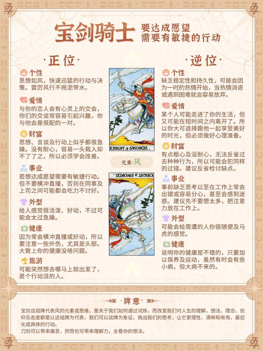 骑士虽因性急而容易失去理智的力量。但进取的精神可嘉。他代表着事业心强的人,他们可能缺乏情感,但不是冷漠,只是心不在焉。他们对异性有强烈的吸引力,却无法建立长期的关系。